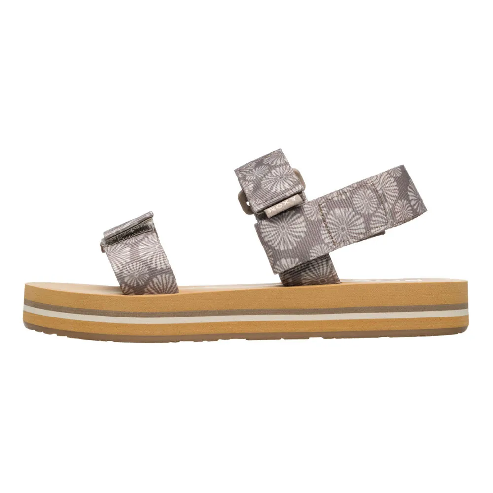 Ovandel i återvunnen textil, självhäftande och justerbar remstängning längs sidan och hälen, mjuk EVA-innersula med ROXY-logotyp och yttersula i gummi med vintage ROXY-tryck