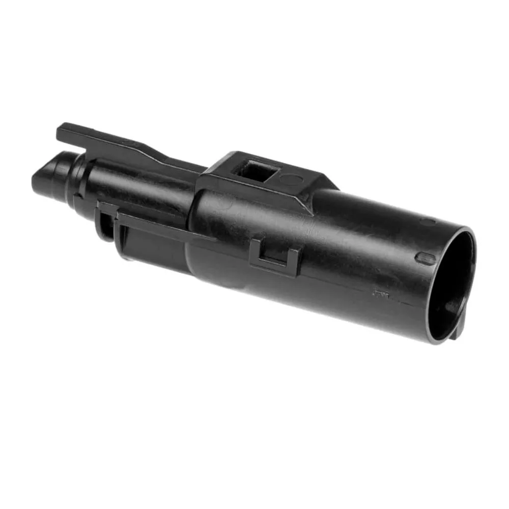 Detta högpresterande laddningsmunstycke är en kritisk komponent i gas blowback-motorn. Det är noggrant utformat för att utföra den dubbla funktionen att ladda en ny kula och rikta trycksatt gas för både framdrivning och mantelrörelse. Vid avfyrning kanaliserar det gas framåt för att driva kulan nerför pipan, och riktar samtidigt gas bakåt för att skjuta manteln bakåt, vilket skapar den realistiska blowback-aktionen När manteln återgår till sitt låsta läge är munstycksenheten ansvarig för att plocka upp nästa kula från magasinet, vilket gör den avgörande för pistolens halvautomatiska funktion. Designen inkluderar noggrant utformade gasportar, inklusive de primära framåtriktade munstyckena, för att säkerställa att luftflödet hanteras optimalt för kraft och effektivitet.